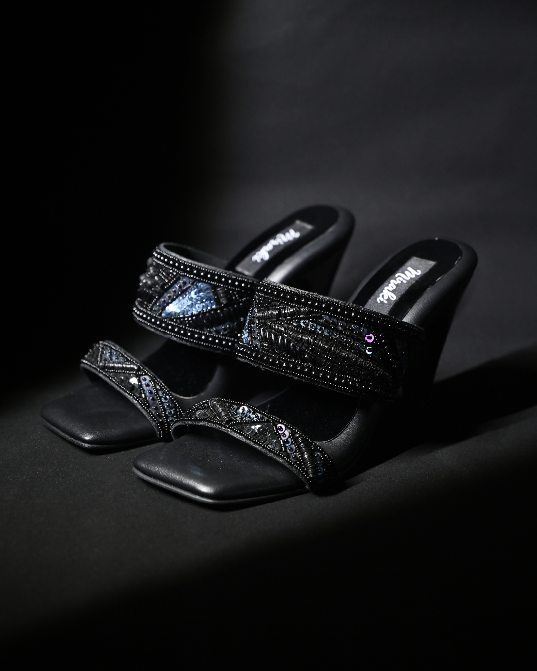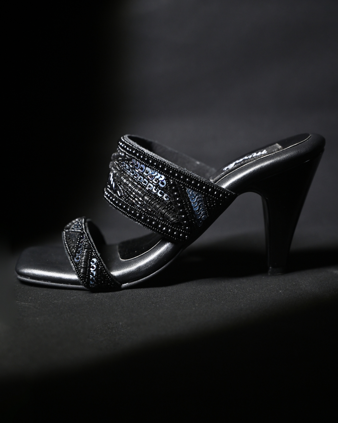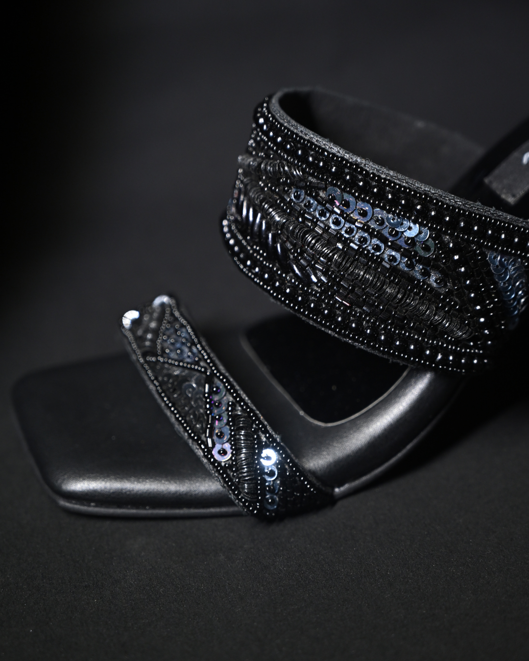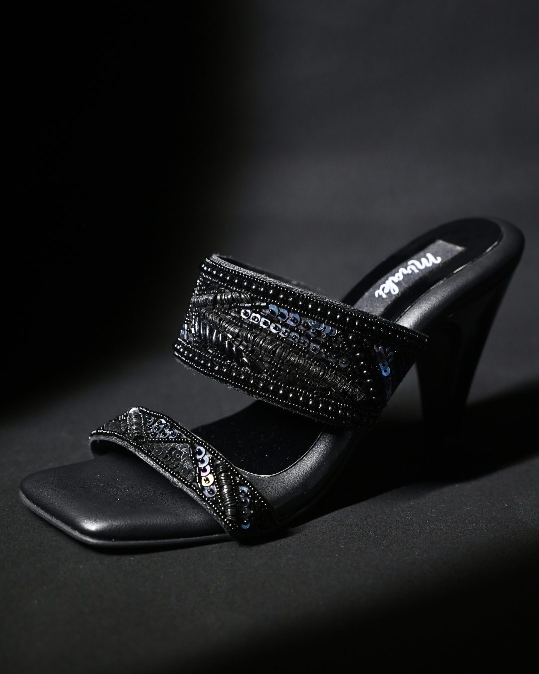 Featuring a pair of antique black embroidered heels. The intricate thread work details with sequins, pearls and beads are sure to add glamour and elegance to your look. The 3.5 inch heel can be customized to the heel height of your choice. Extra soft padding has been provided for comfort.