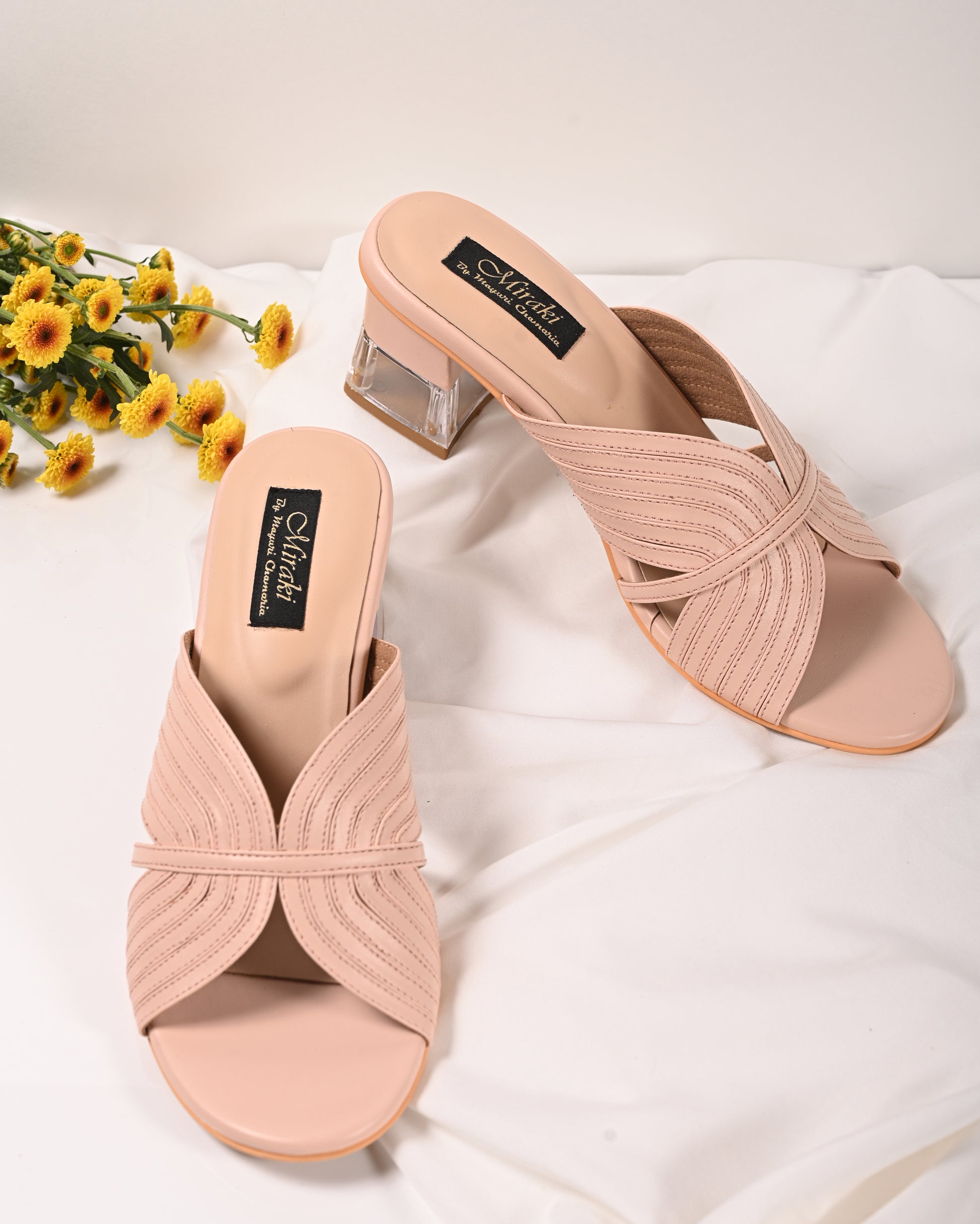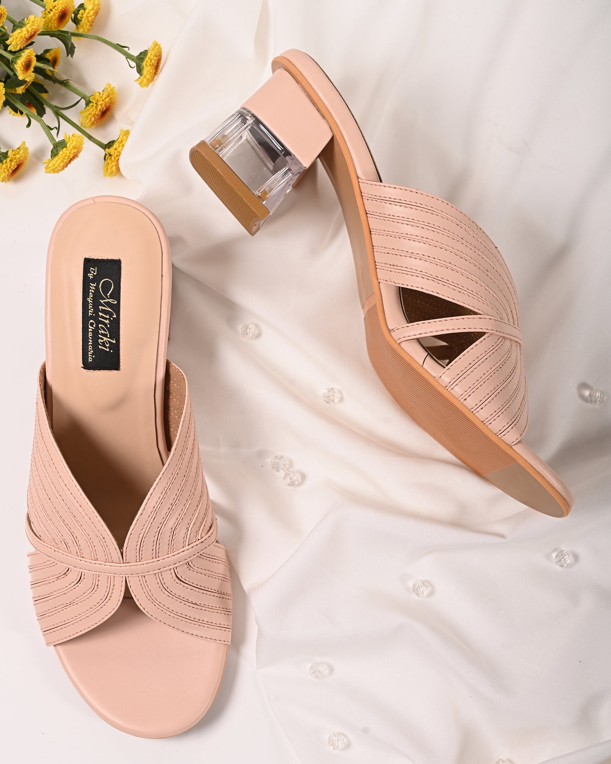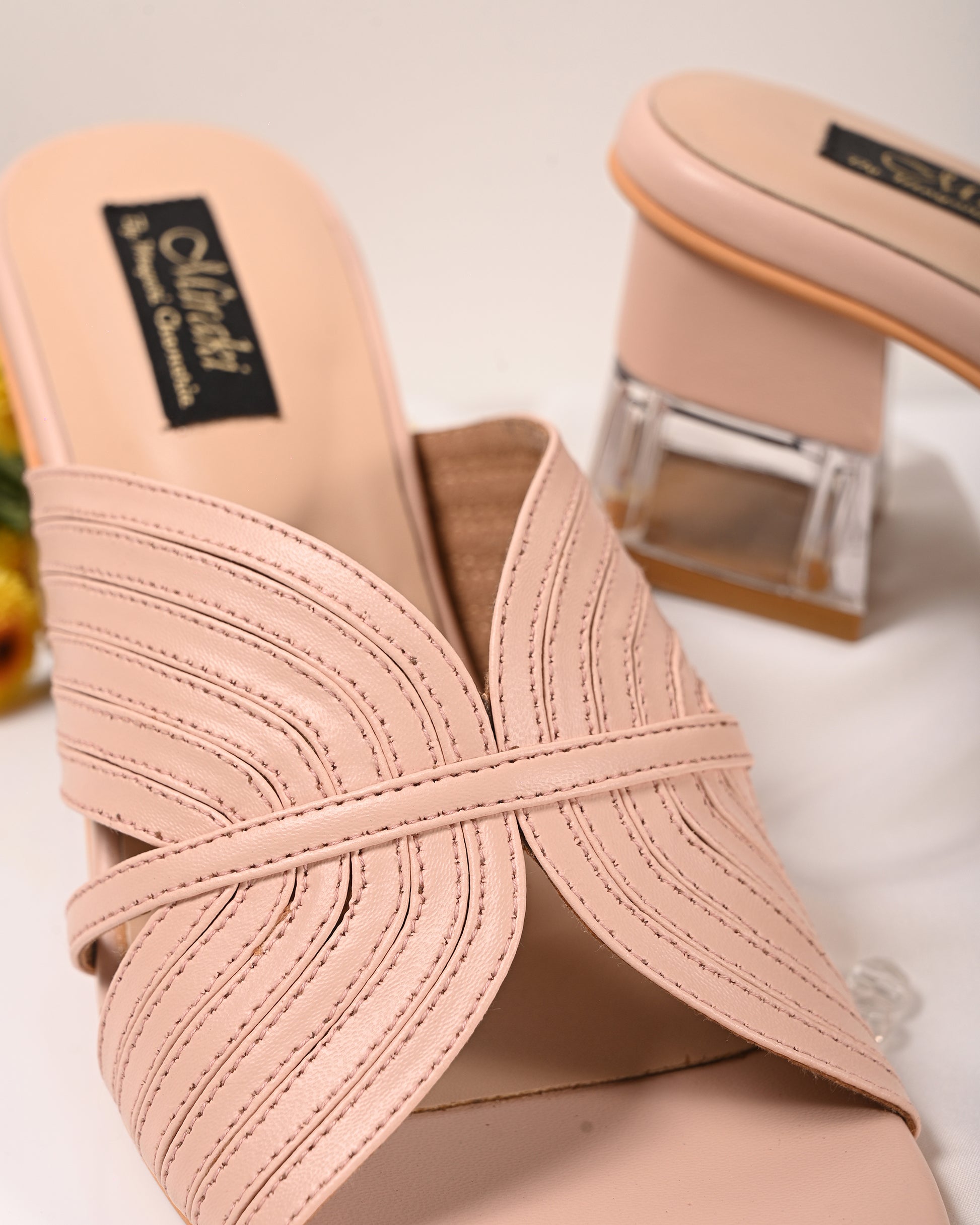Featuring a pair of slip-ons in powder pink vegan leather with strappy stitching details and block transparent heels.