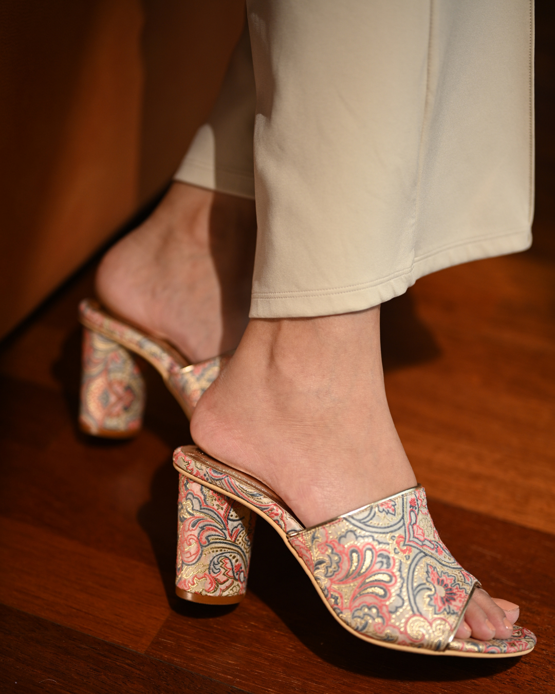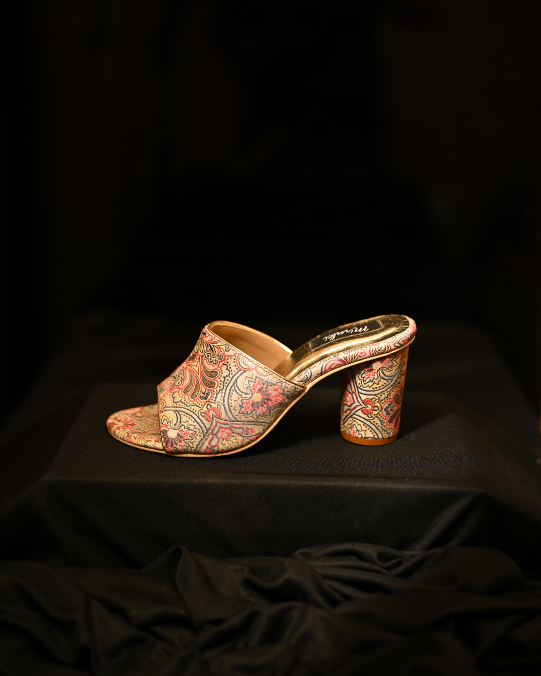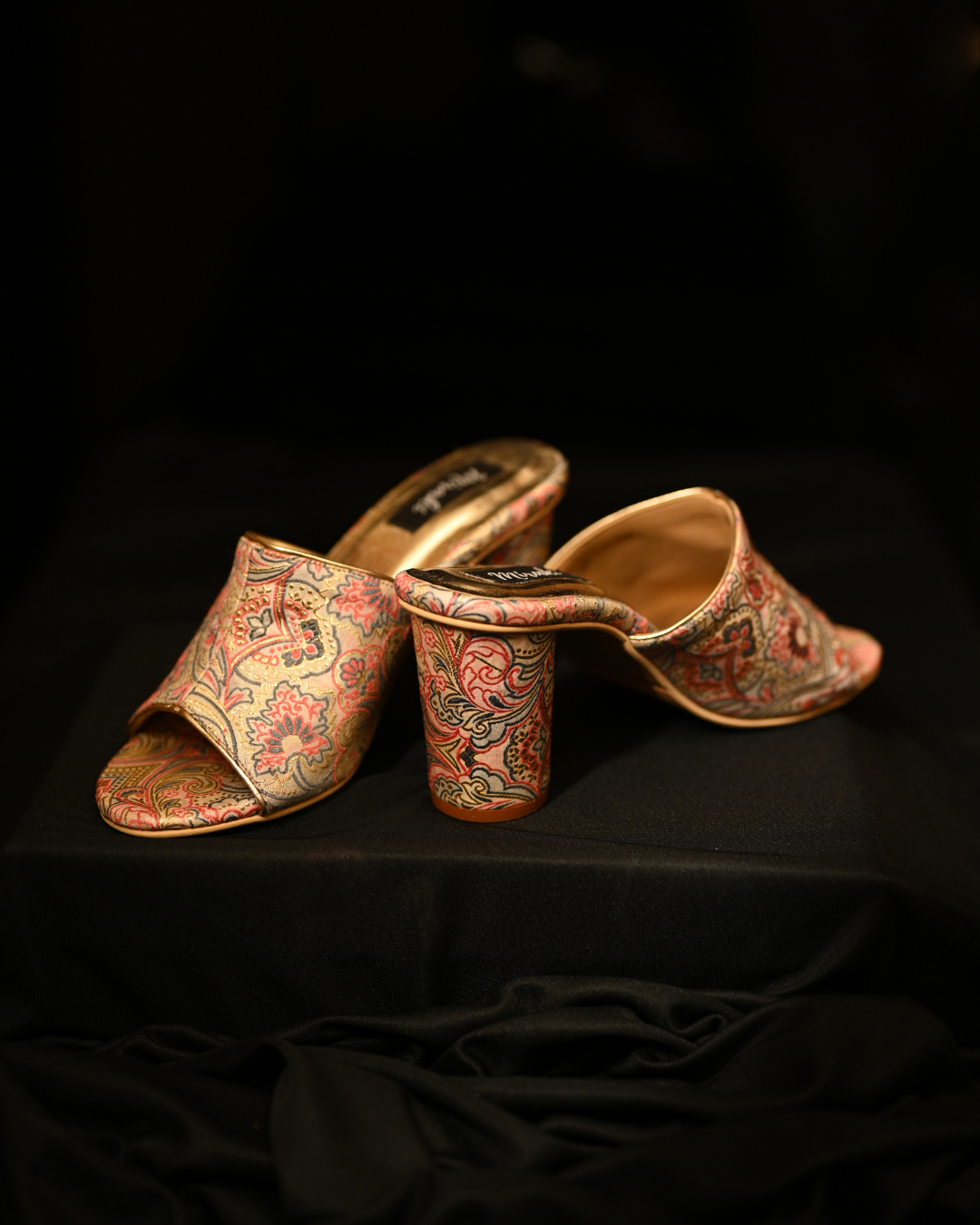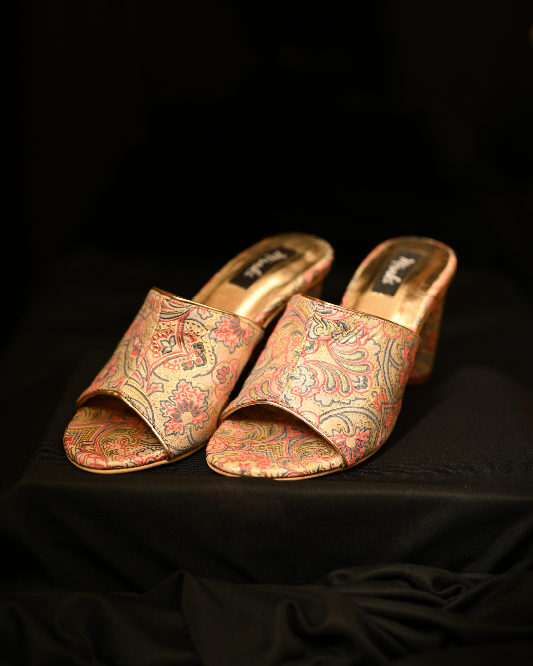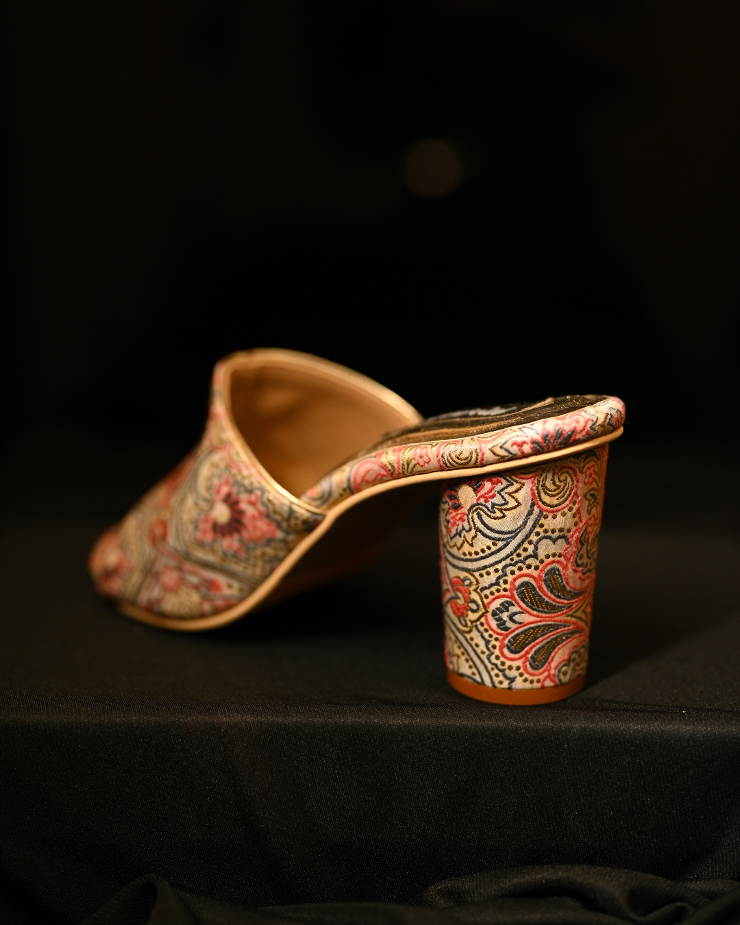 Featuring a beautiful pair of brocade mules with these unique round block heels which makes them stylish yet easy to wear for long hours. These are perfect for making a statement because of the unique blend of colours with the gold highlighting. Extra soft padding has been provided for comfort.