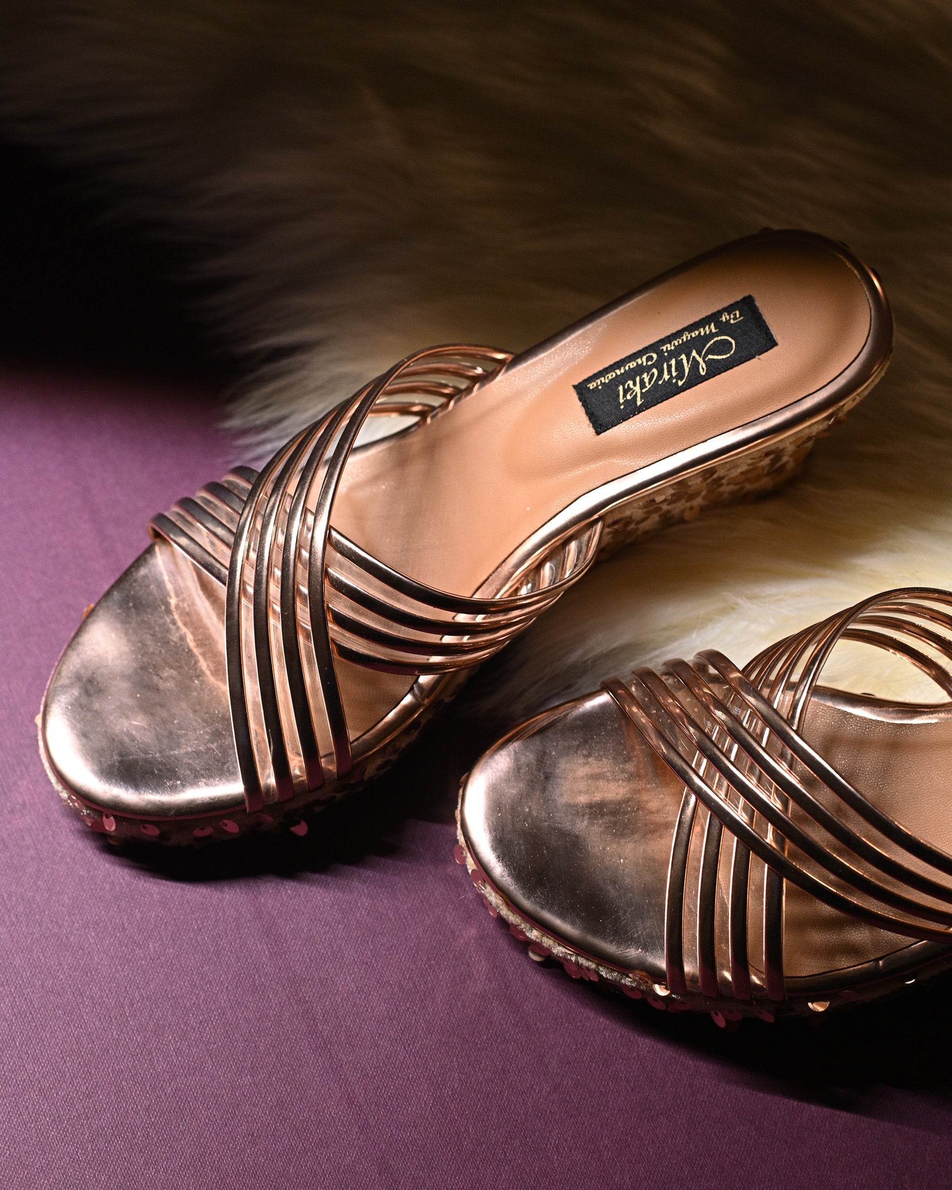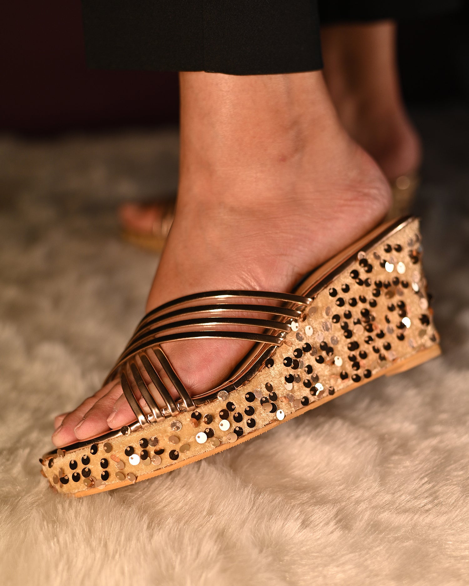 Featuring a pair of super comfortable rose gold cross strap wedges with sequins detailing.