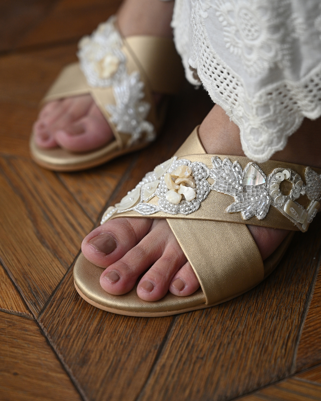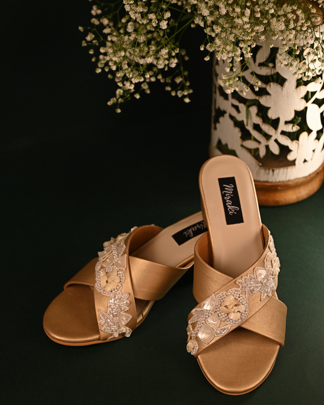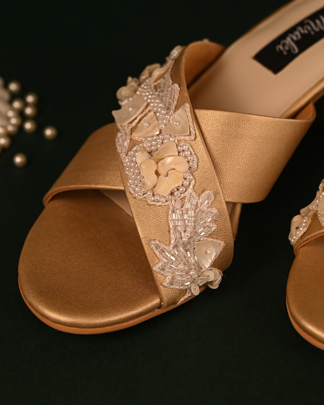Featuring a pair of gold cross strap block heels with stunning handwork details. A unique combination of shells, beads and pearls have been used to make this timeless beauty.