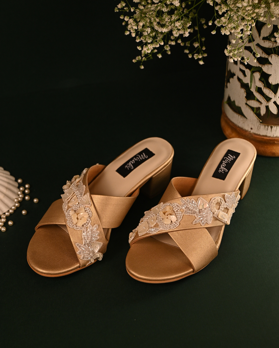 Gold Criss Cross Strap Block Heels With Shell And Pearl Work