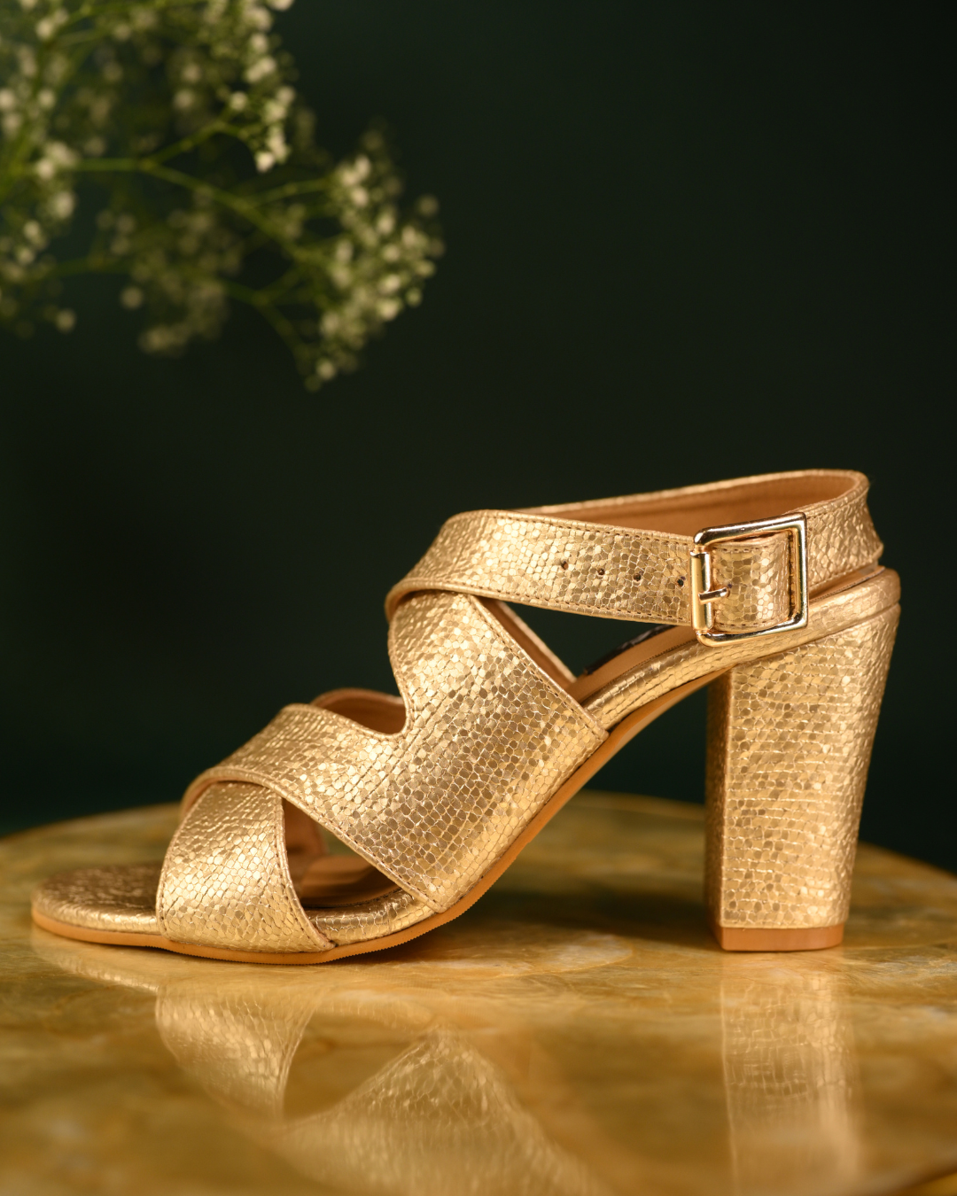 Gold Cross Strap Block Heels With Ankle Strap