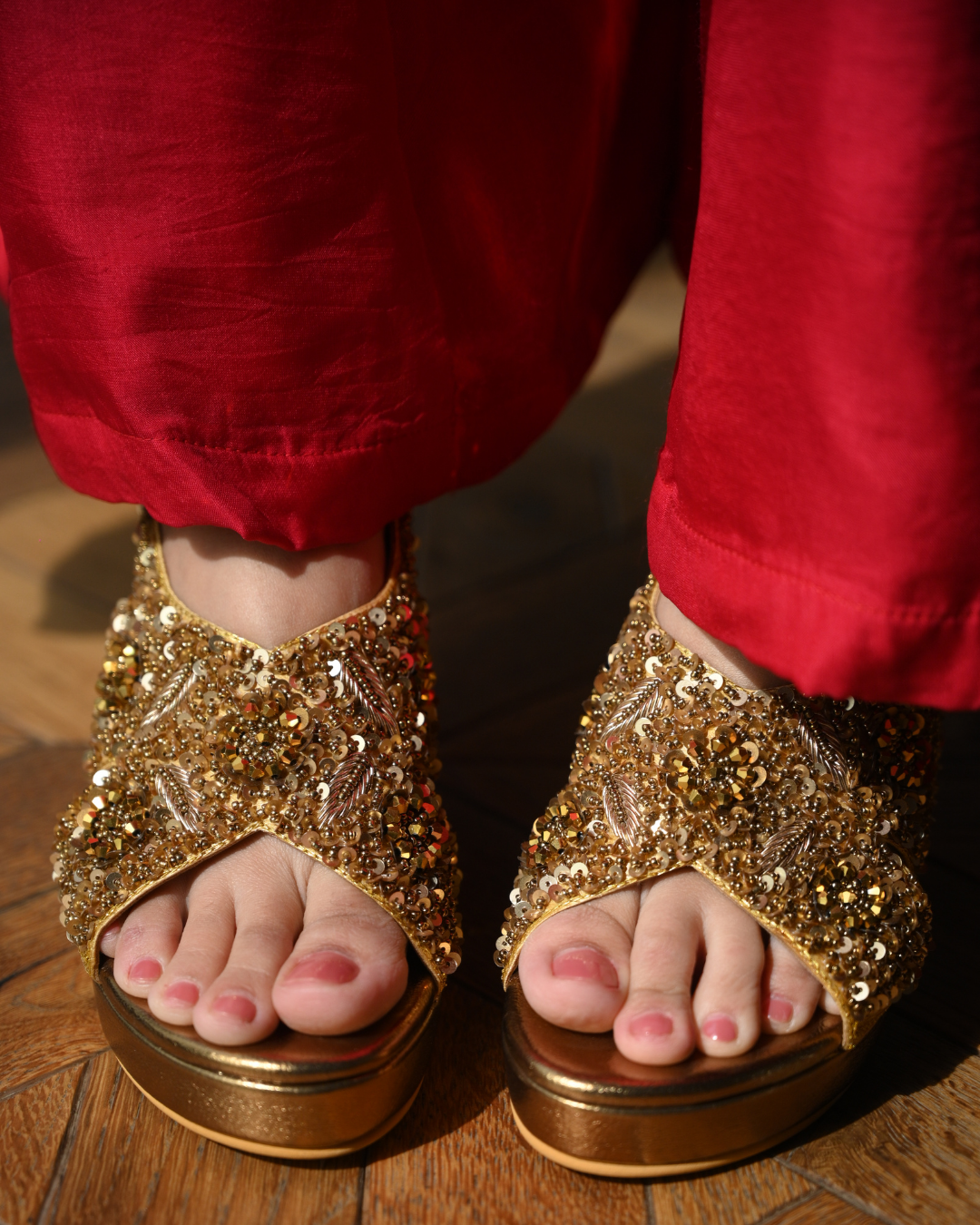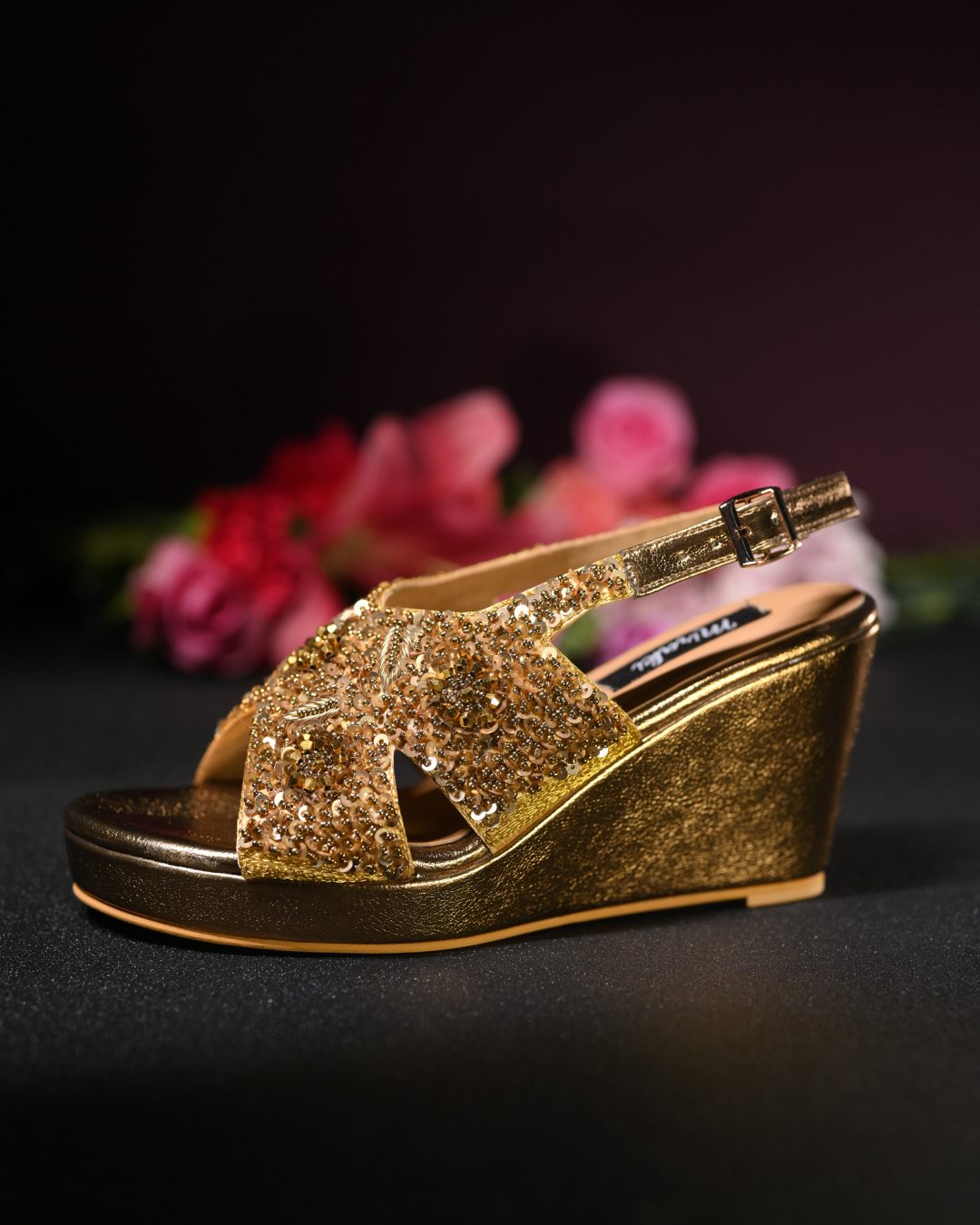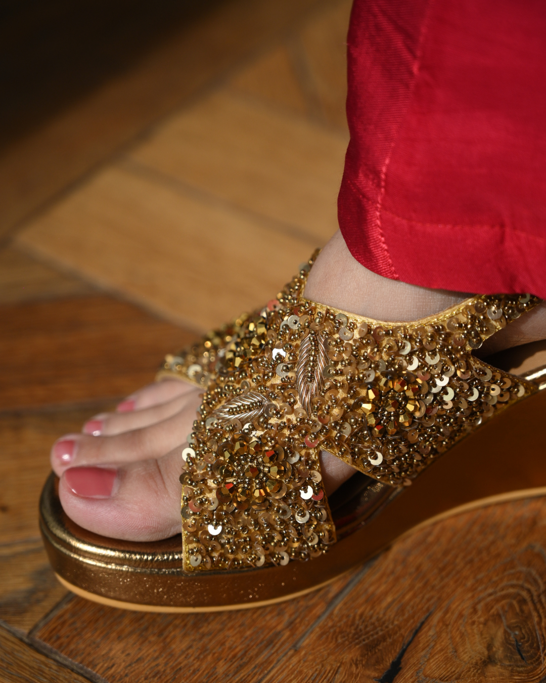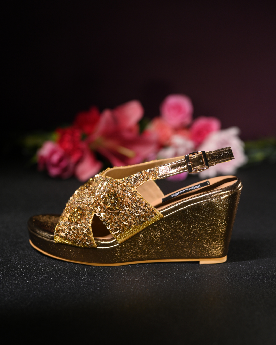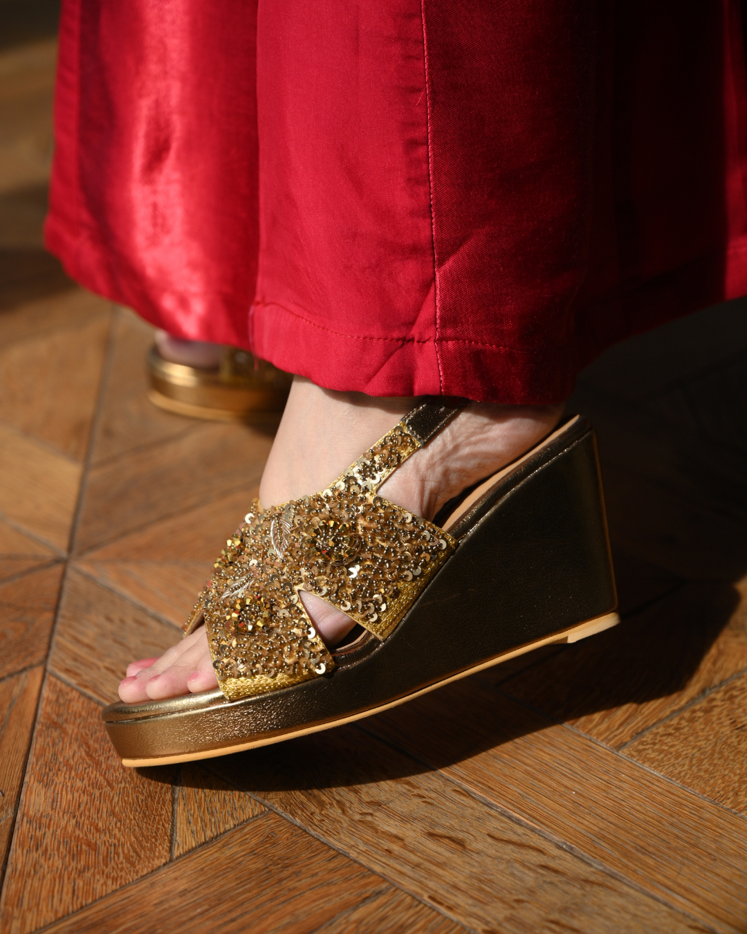Mark your wedding day in style with these hand work embroidered wedges that provide unparalleled beauty and elegance. The wedges offer superior comfort and are sure to elevate your silhouette to new heights of luxury.