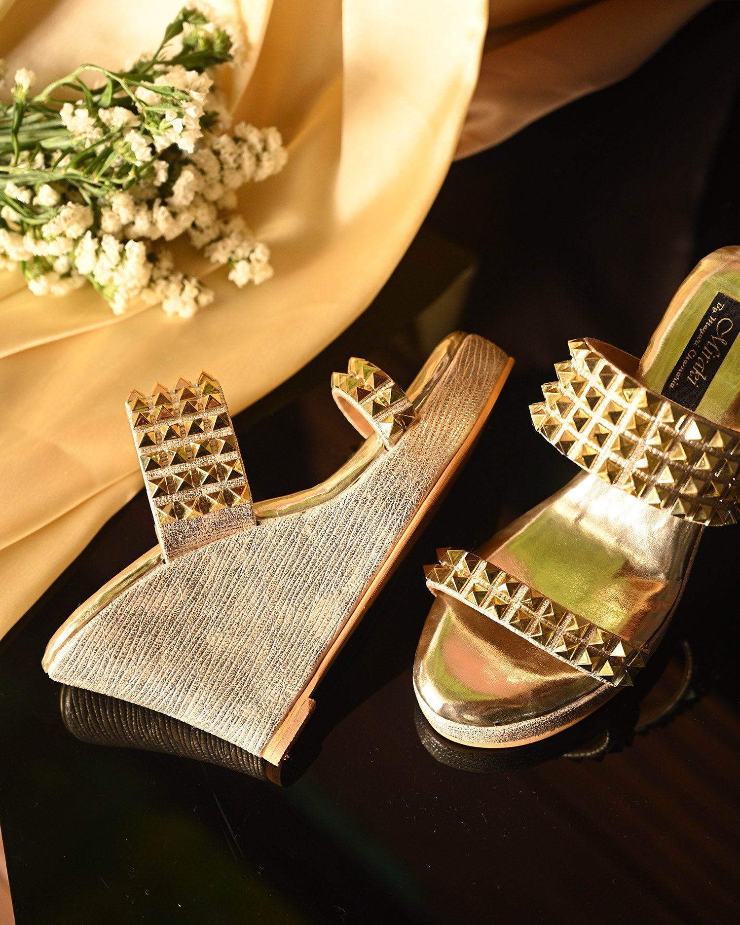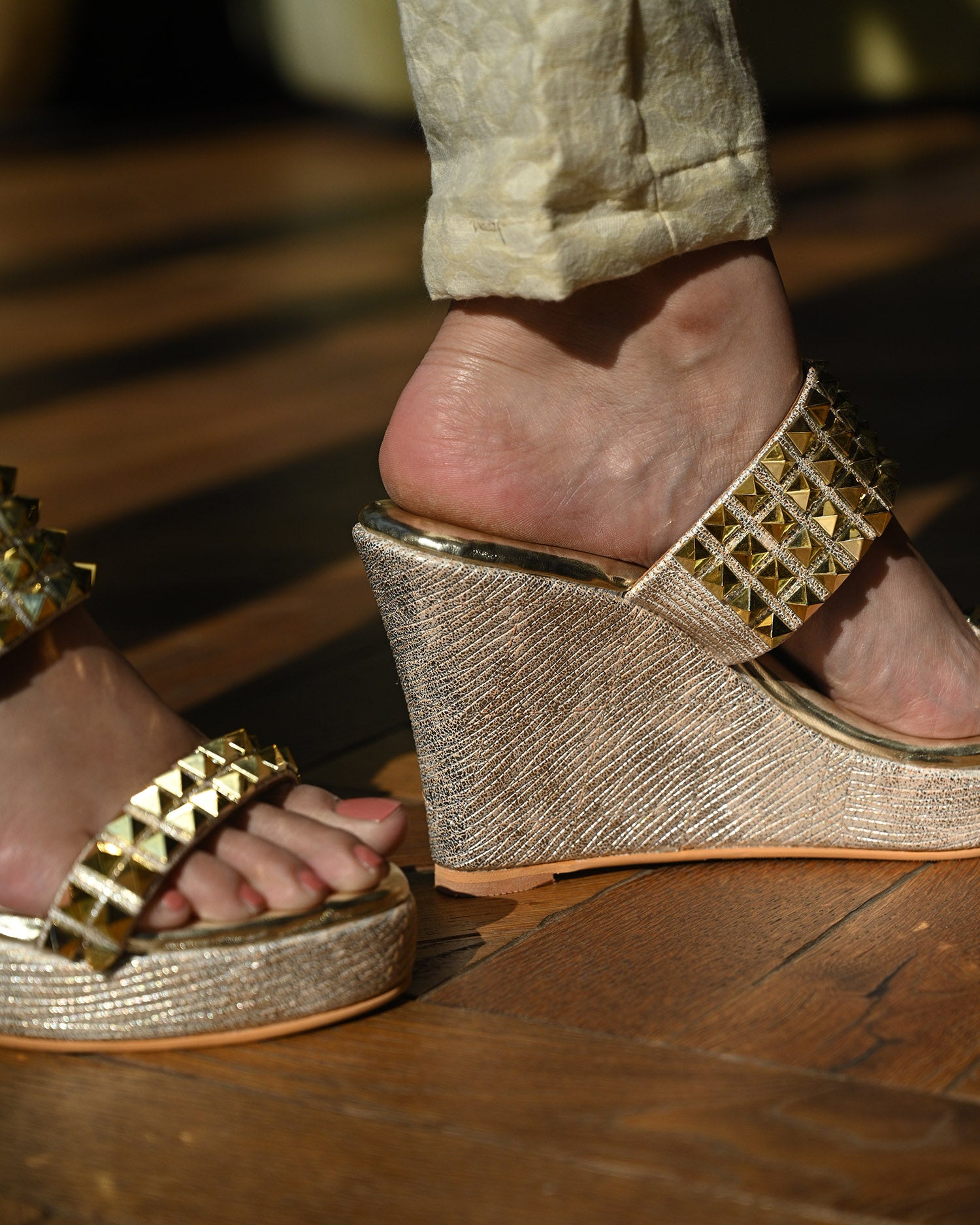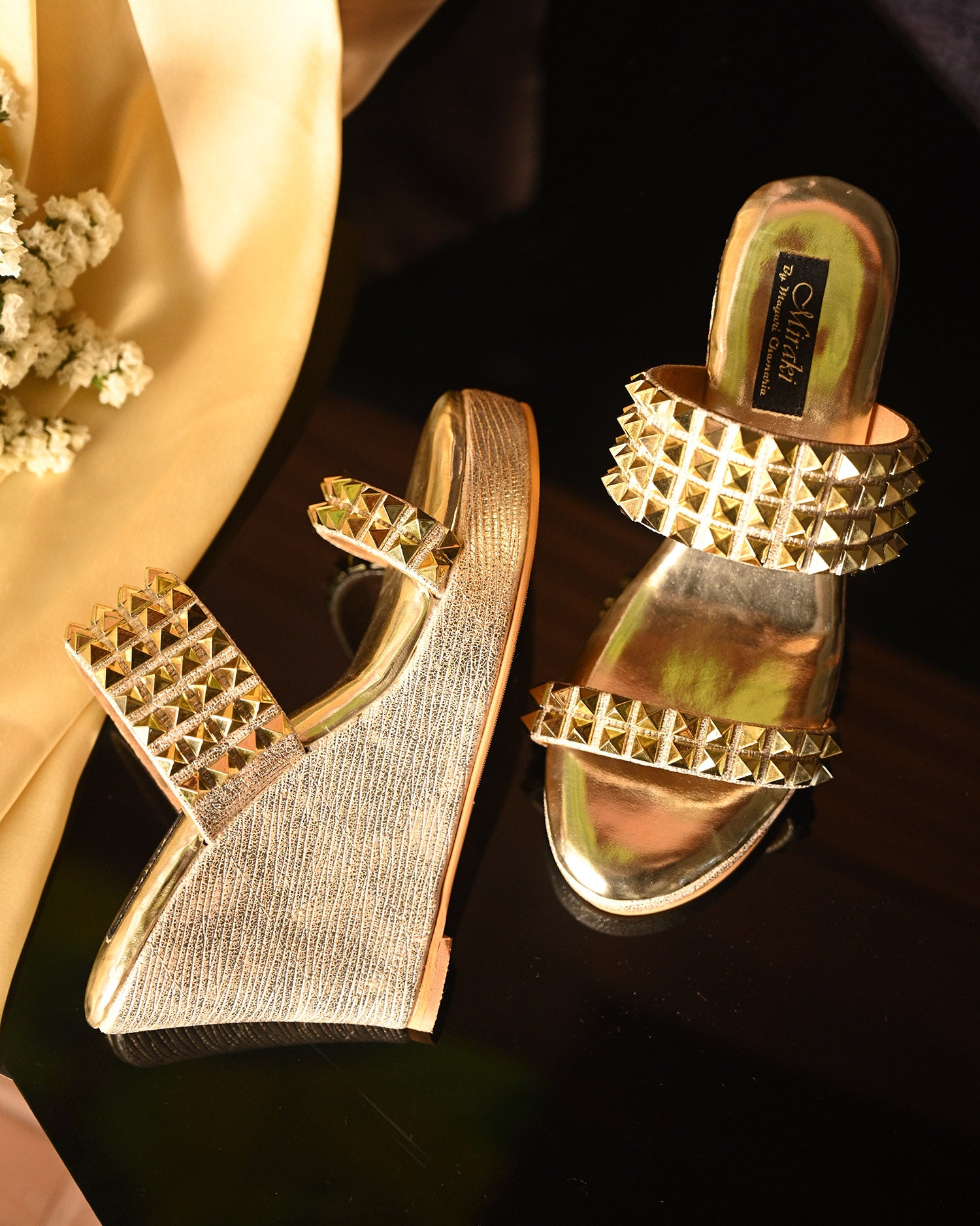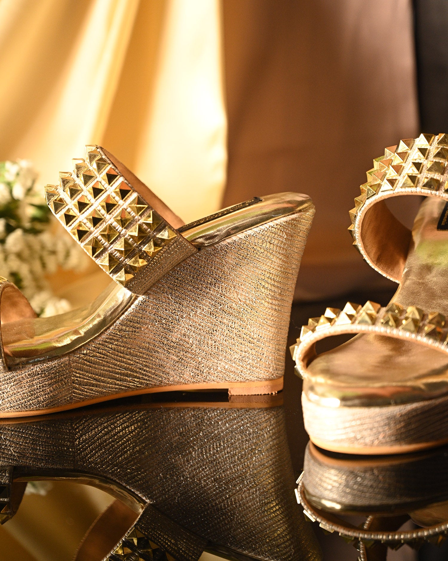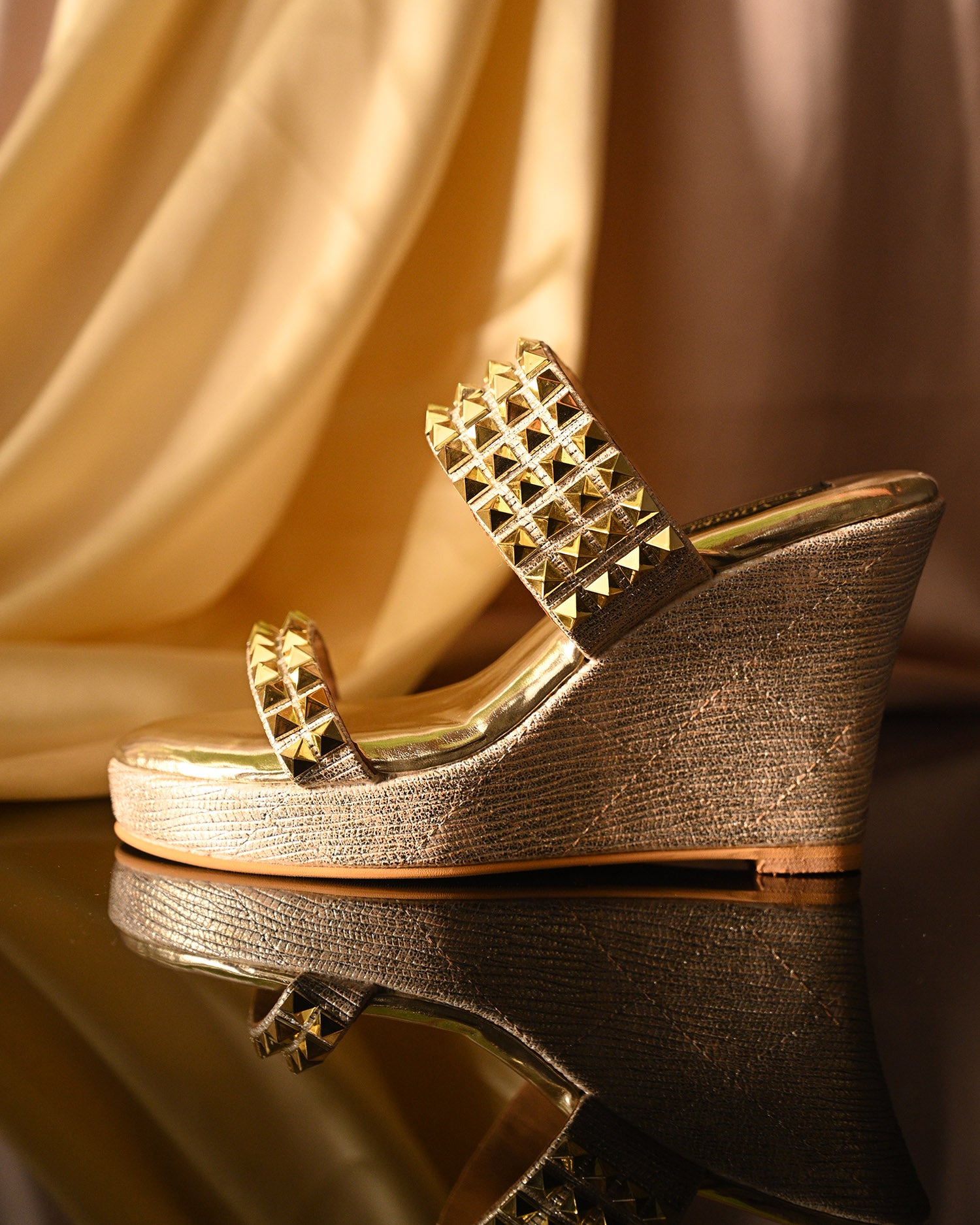 Featuring a pair of gold slip-on wedges embellished with studs, perfect for making a statement.