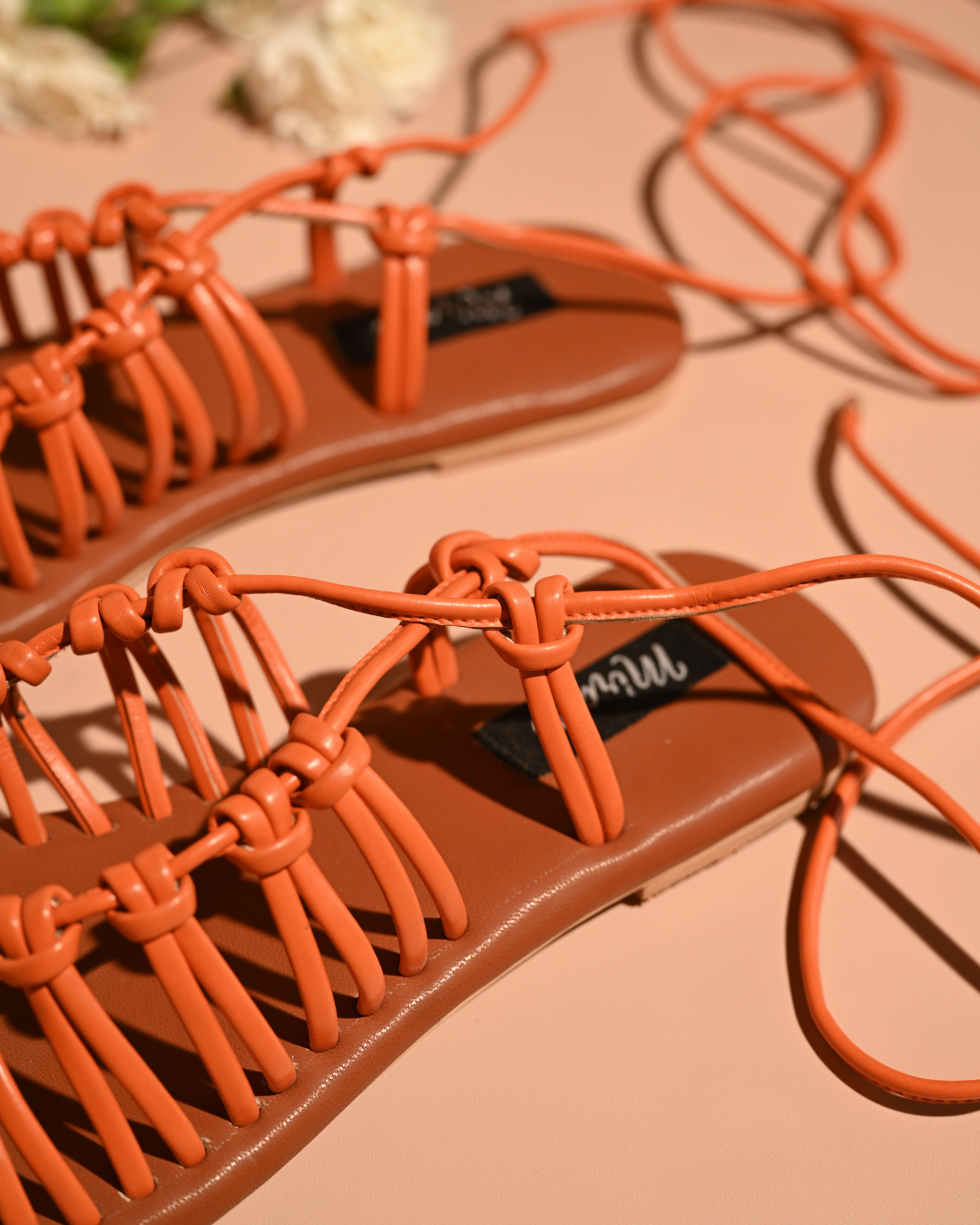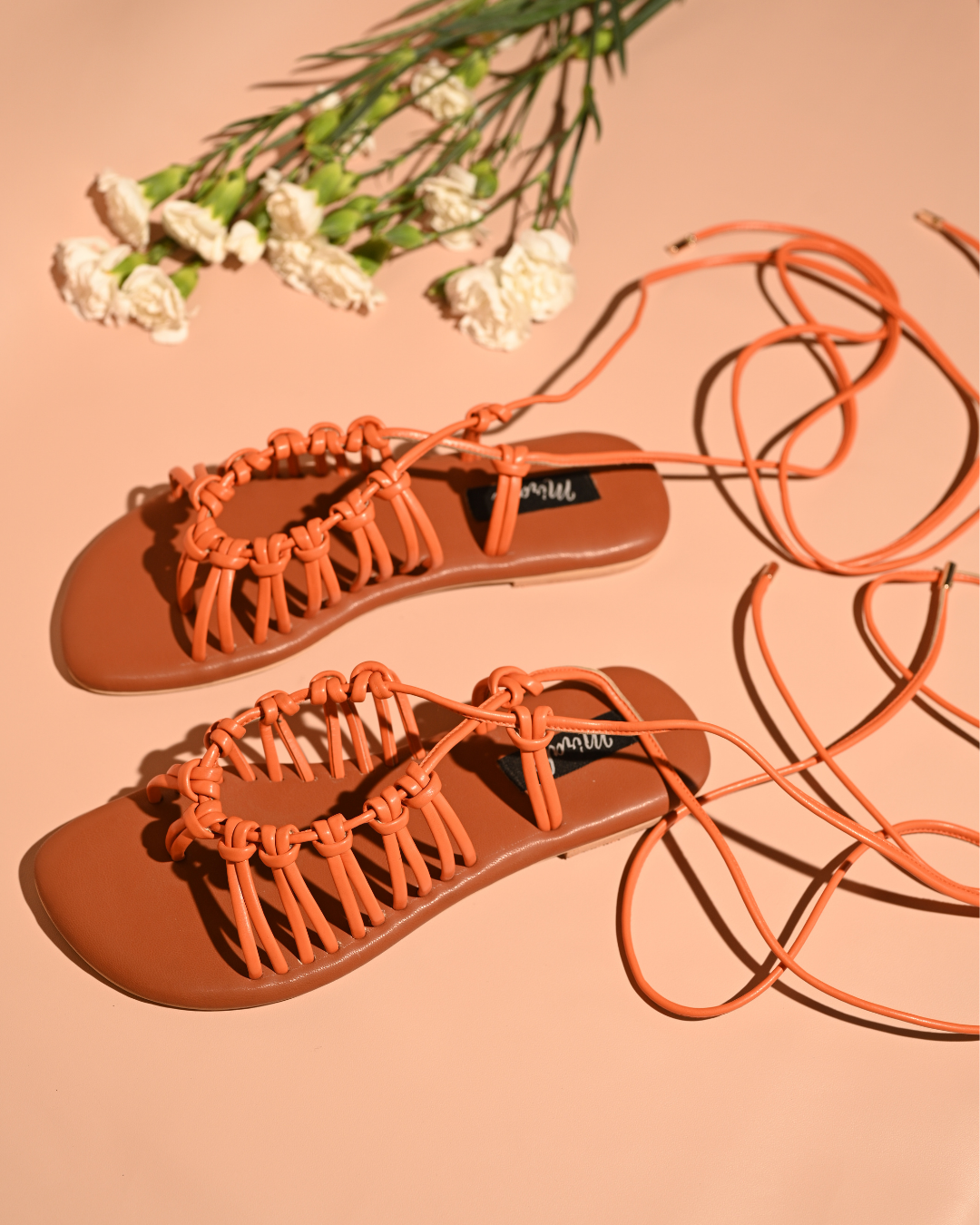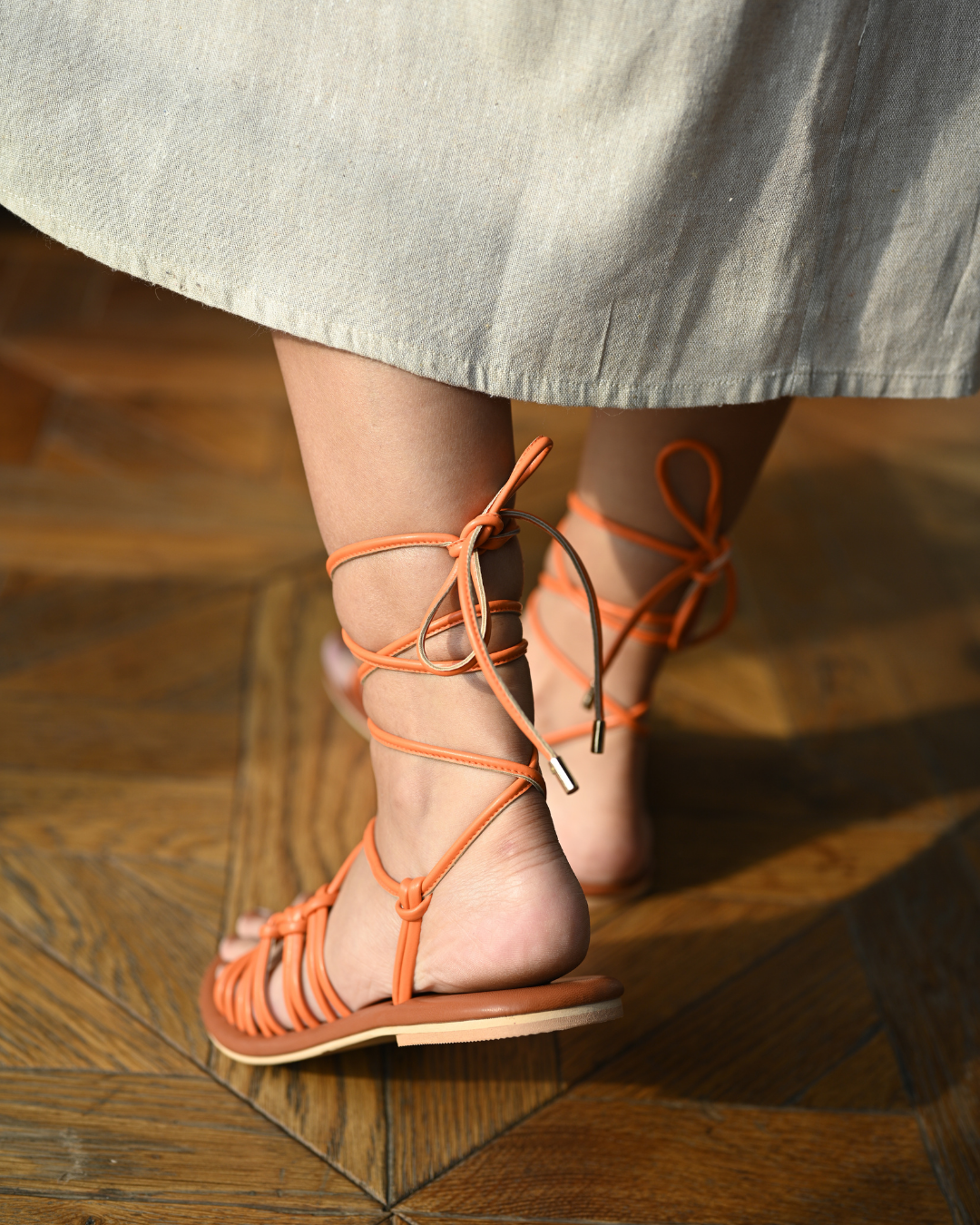 Step into this season with our vibrant orange tie-up flats, perfect for beach days or pairing with a dress. These stylish flats feature long strings that wrap gracefully up your legs, adding a playful and trendy touch to your look. Lightweight and comfortable, they are the ideal choice for a relaxed yet chic vibe.