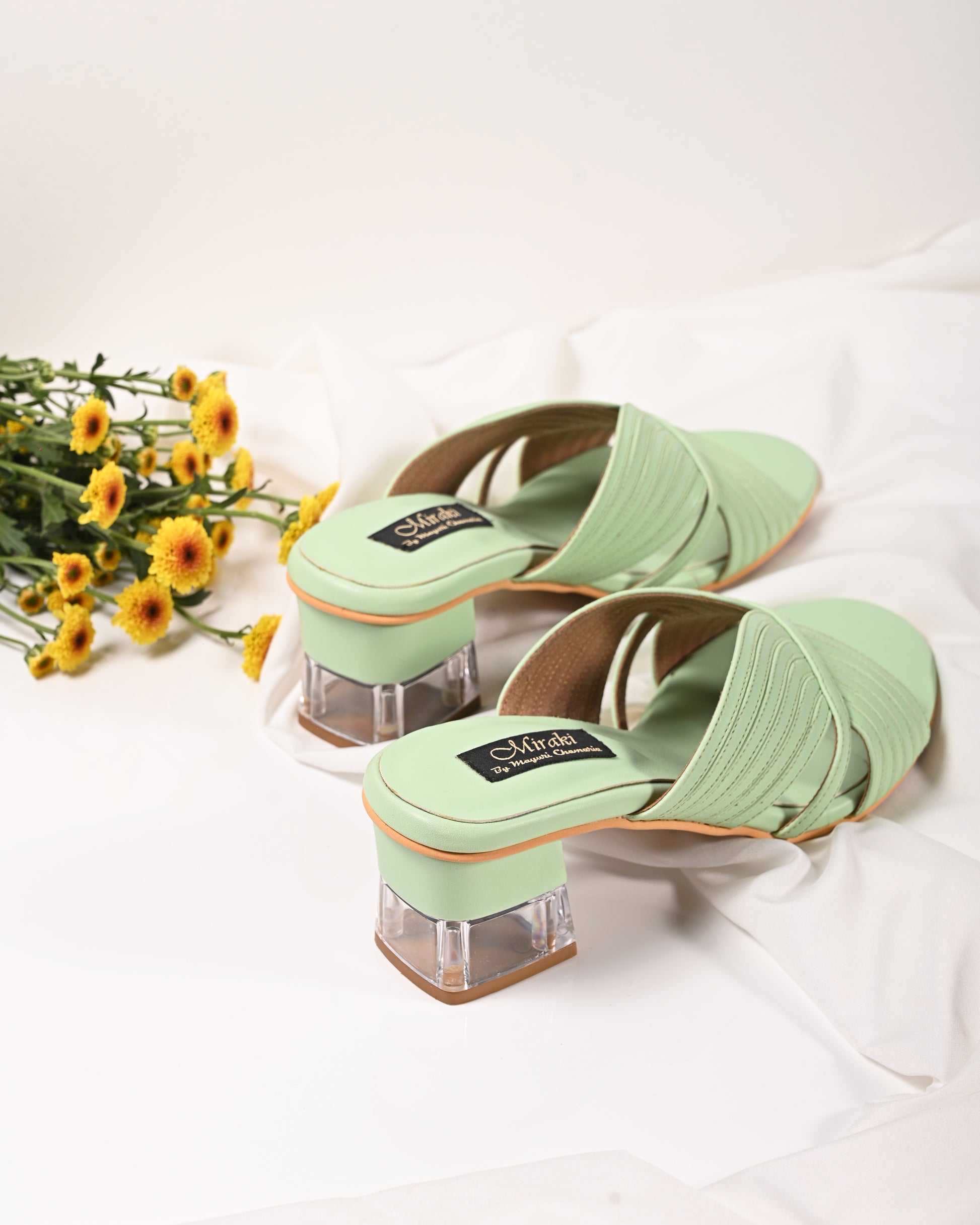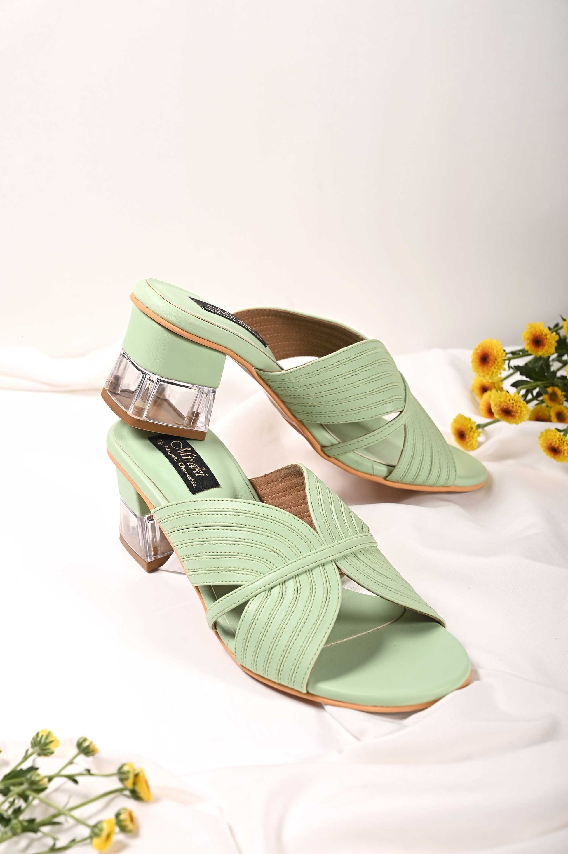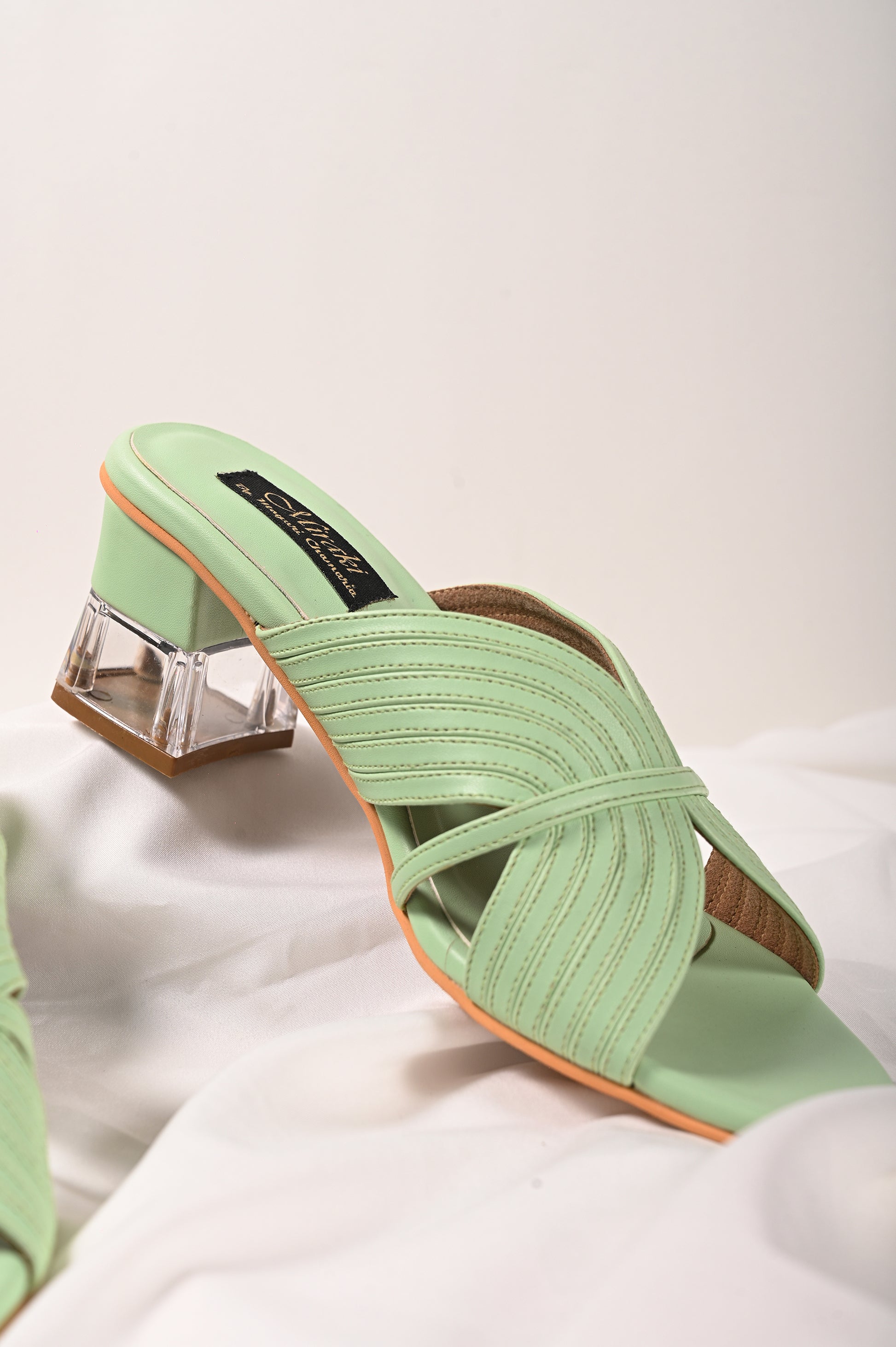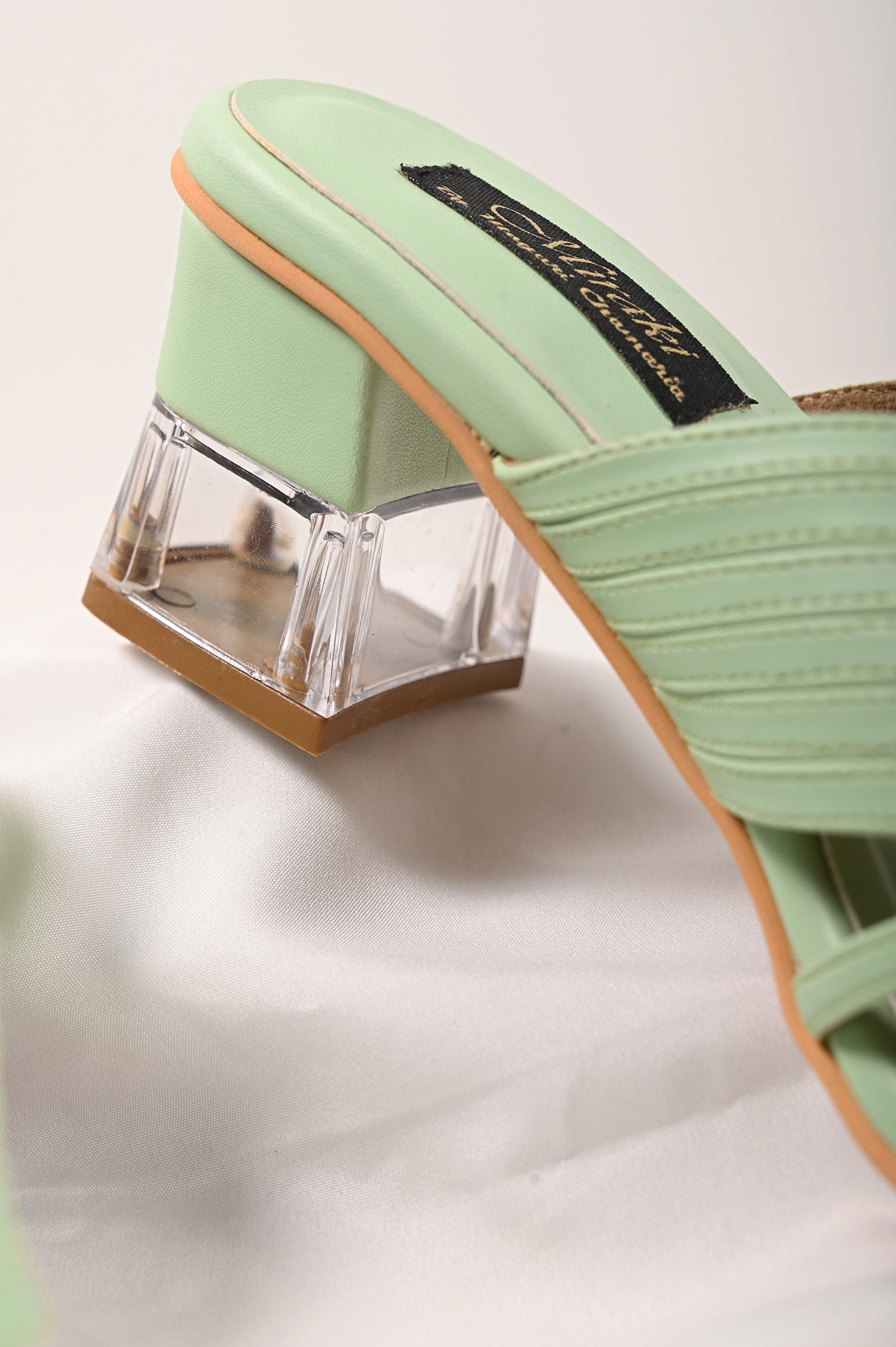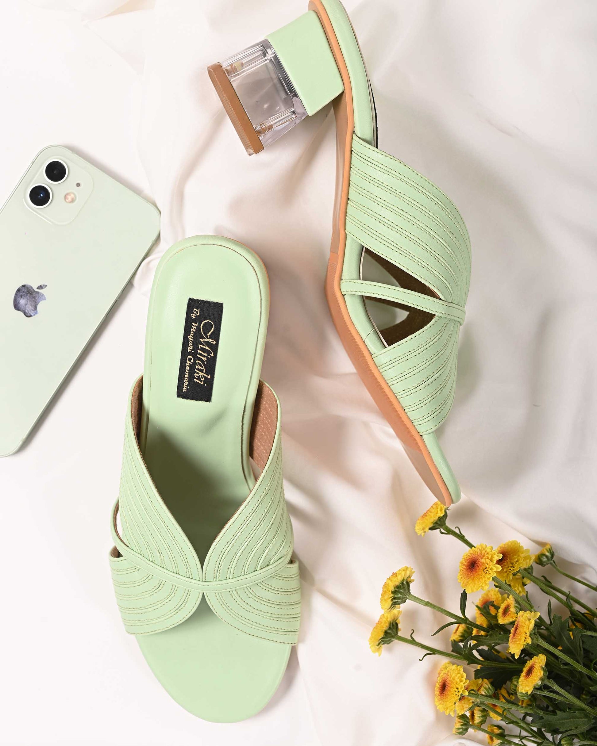 Featuring a pair of slip-ons in pastel green vegan leather with strappy stitching details and block transparent heels.