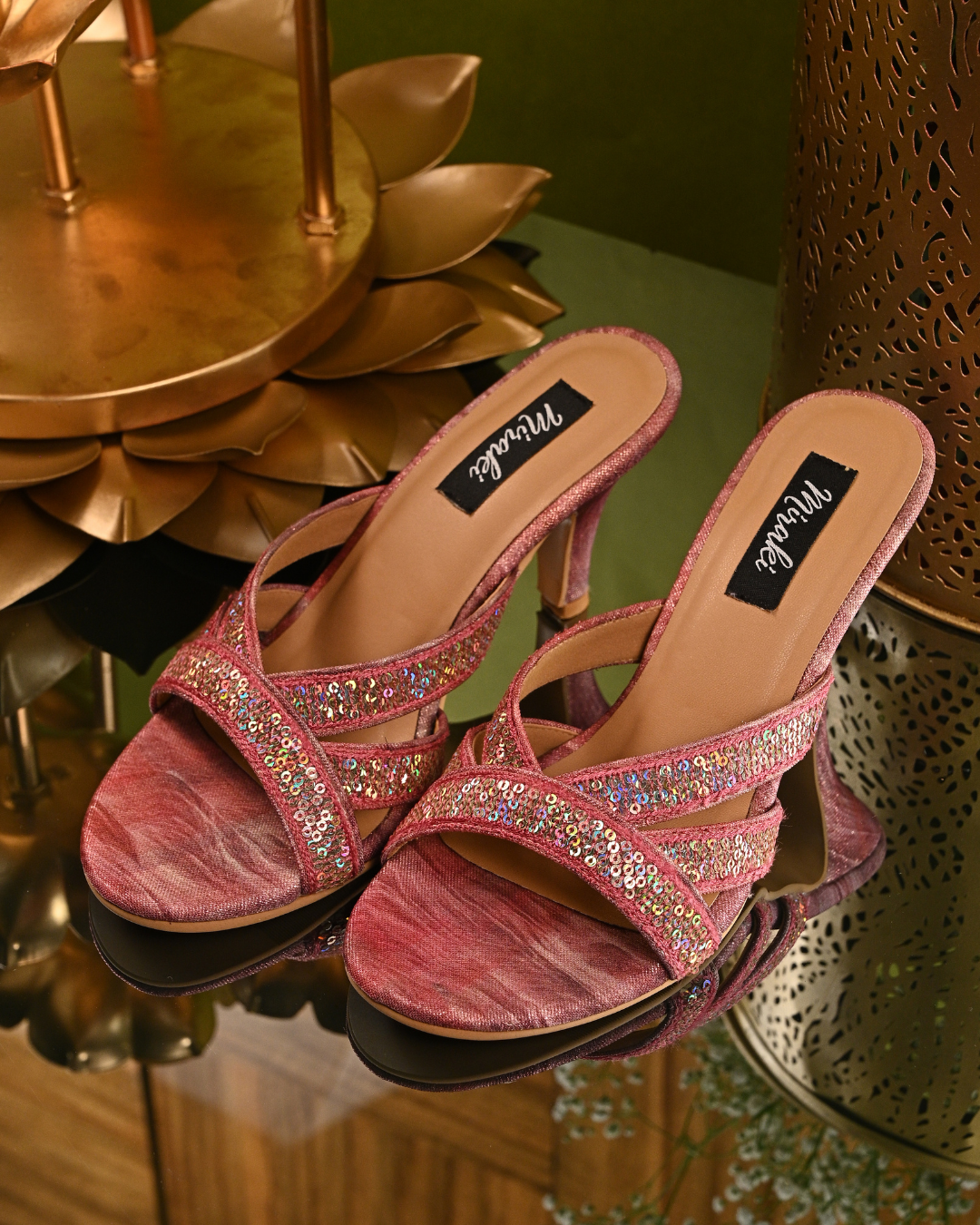 Featuring a pair of chic and classy slip on heels with rainbow sequins and thread work.