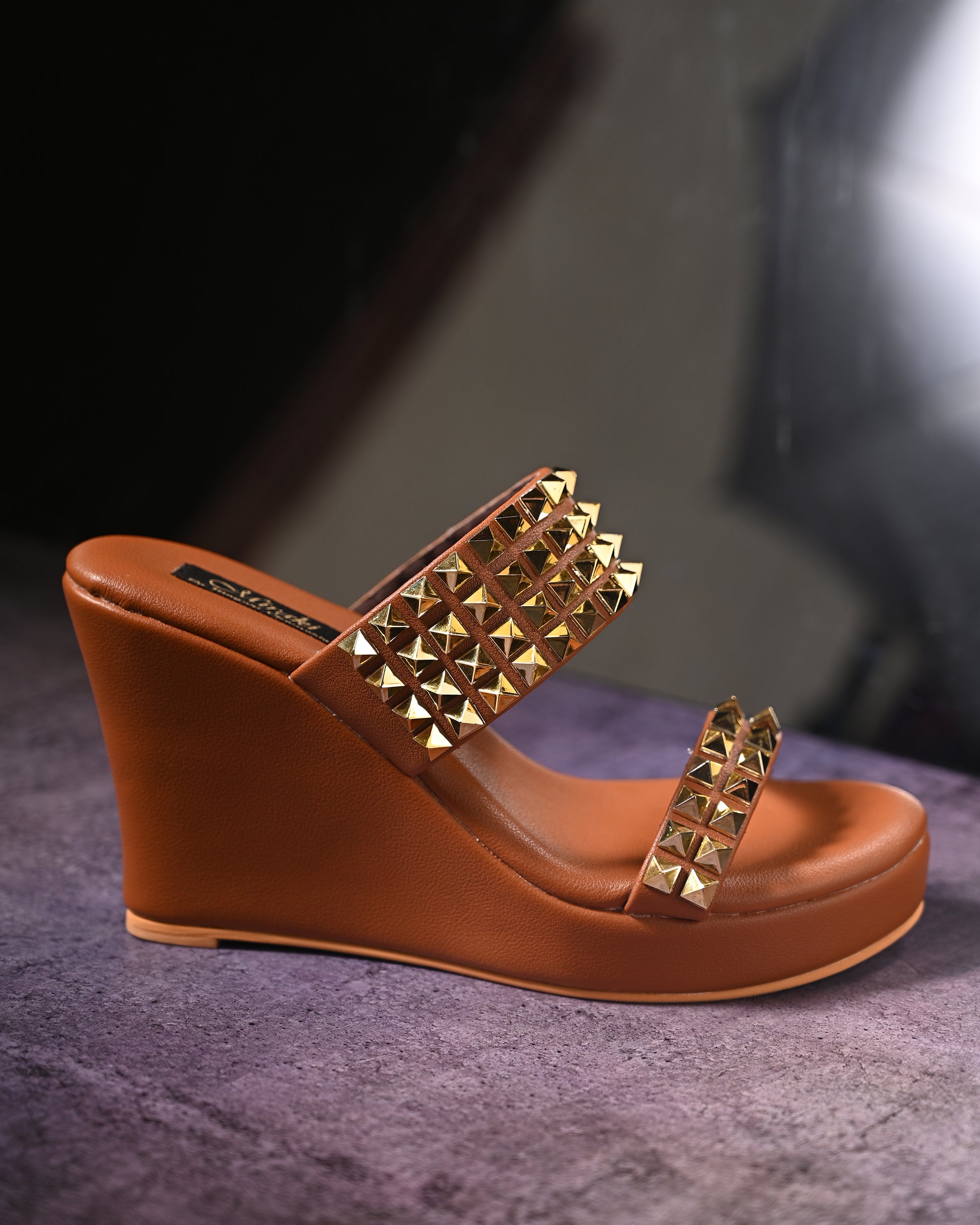 Featuring a pair of tan slip-ons wedges embellished with studs perfect for making a statement.