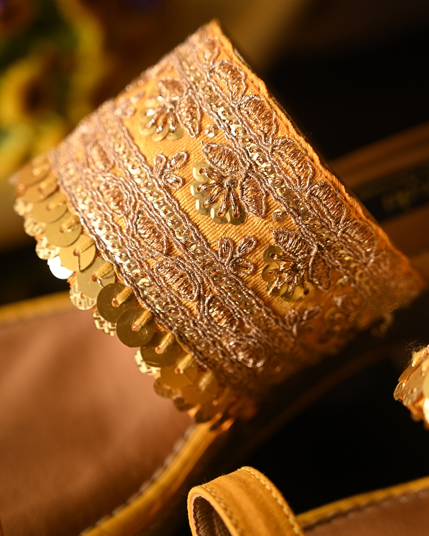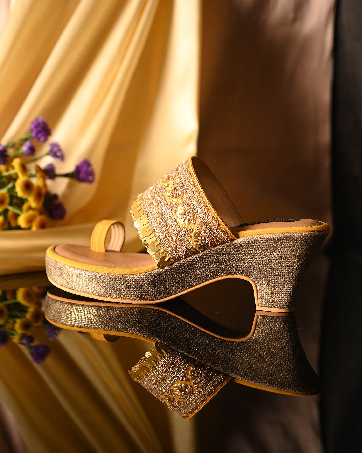 Featuring a pair of elegant wedges with intricate gold hand work details perfect for the wedding season.